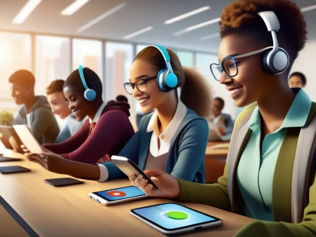 En una aula futurista, estudiantes diversos se sumergen en actividades de MLearning